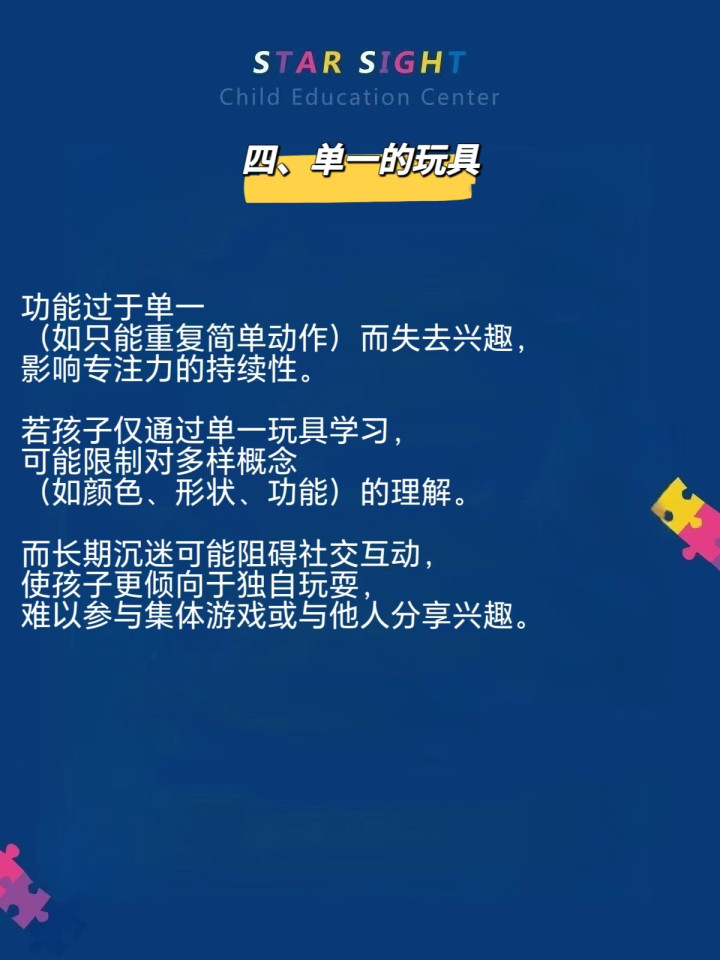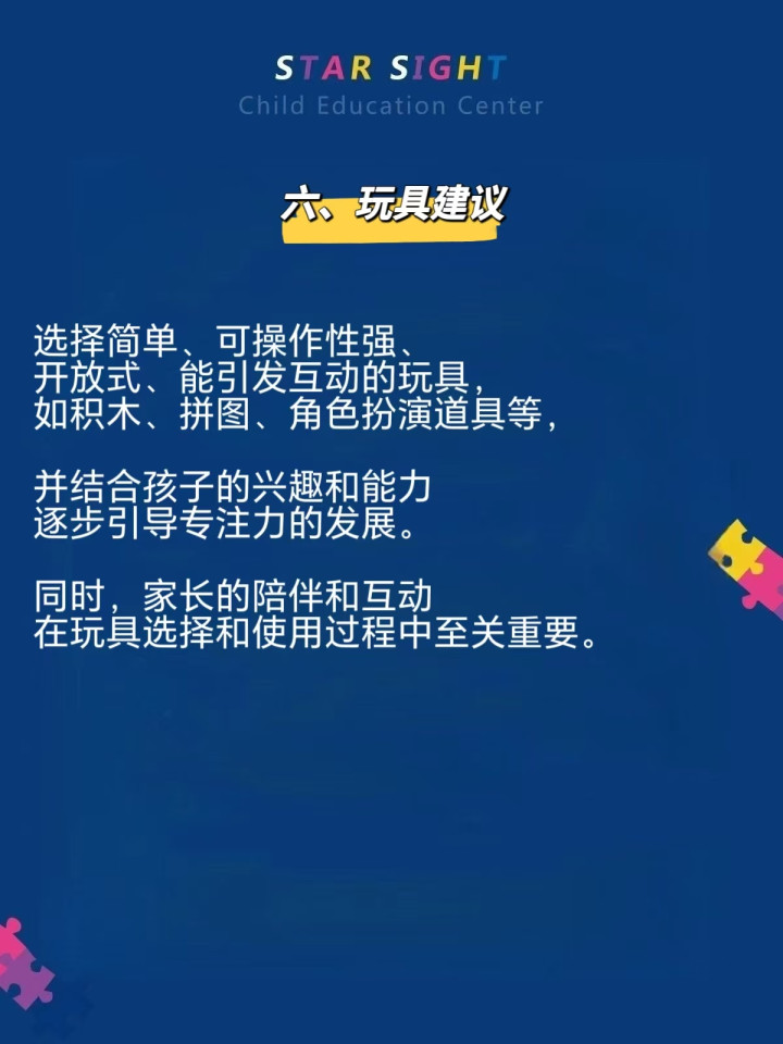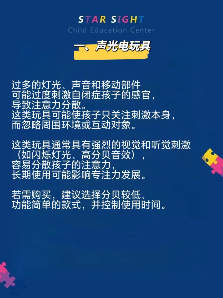 家长朋友们与其给孩子不停地买买买,不如用心的挑,在合格、安全的基础上,尽量挑选符合孩子能力、有趣的玩具,少买声光电玩具,优先买玩法多样的开放式、有真实感的益智类玩具;手机、iPad、平板也要尽可能少给孩子看;非要买的话,也尽量选分贝不高、不刺眼、有益智功能的玩具。
